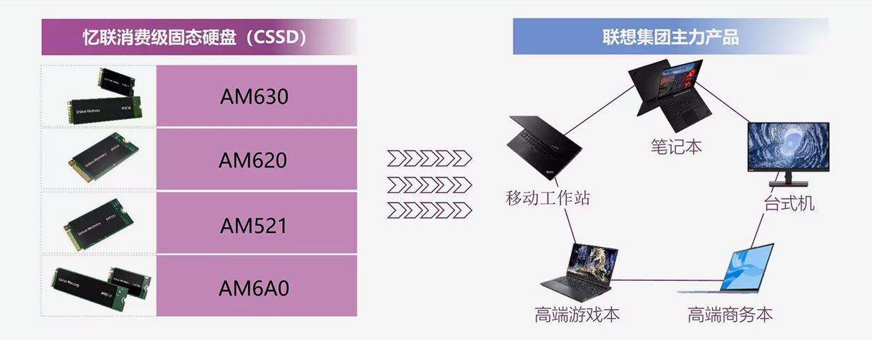 提供全線消費級固態硬盤(CSSD)產品,覆蓋多種規格、接口、尺寸、容量,可適配聯想集團的主力產品,包括高端游戲本,高端商務本,移動工作站等。其中,AM630是業界首款面向OEM客戶的PCle Gen 4方案,產品性能領先于競品。