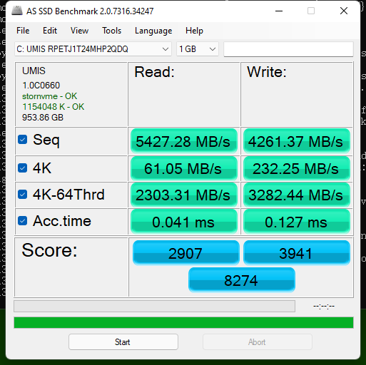 AH660通過采用混合SLC加速區算法,提供了全生命周期的動態SLC加速體驗,從而提高SSD的順序讀寫性能。在開箱性能測試方面,當測試容量為1G時,CDM的順序寫入速度為5.7 GB/s,超過了官方給出的速度。AS SSD Benchmark上的測試結果顯示,AH660 的4K隨機讀寫性可達61.05 MB/s和232.25 MB/s。從官方數據以及測試來看,有理由相信AH660能夠以更快的速度加載應用程序、啟動操作系統,并實現流暢的數據傳輸和游戲加載。無論是進行大型文件的傳輸、多媒體編輯還是游戲加載,AH660都能提供出色的性能表現,為用戶帶來流暢的體驗。