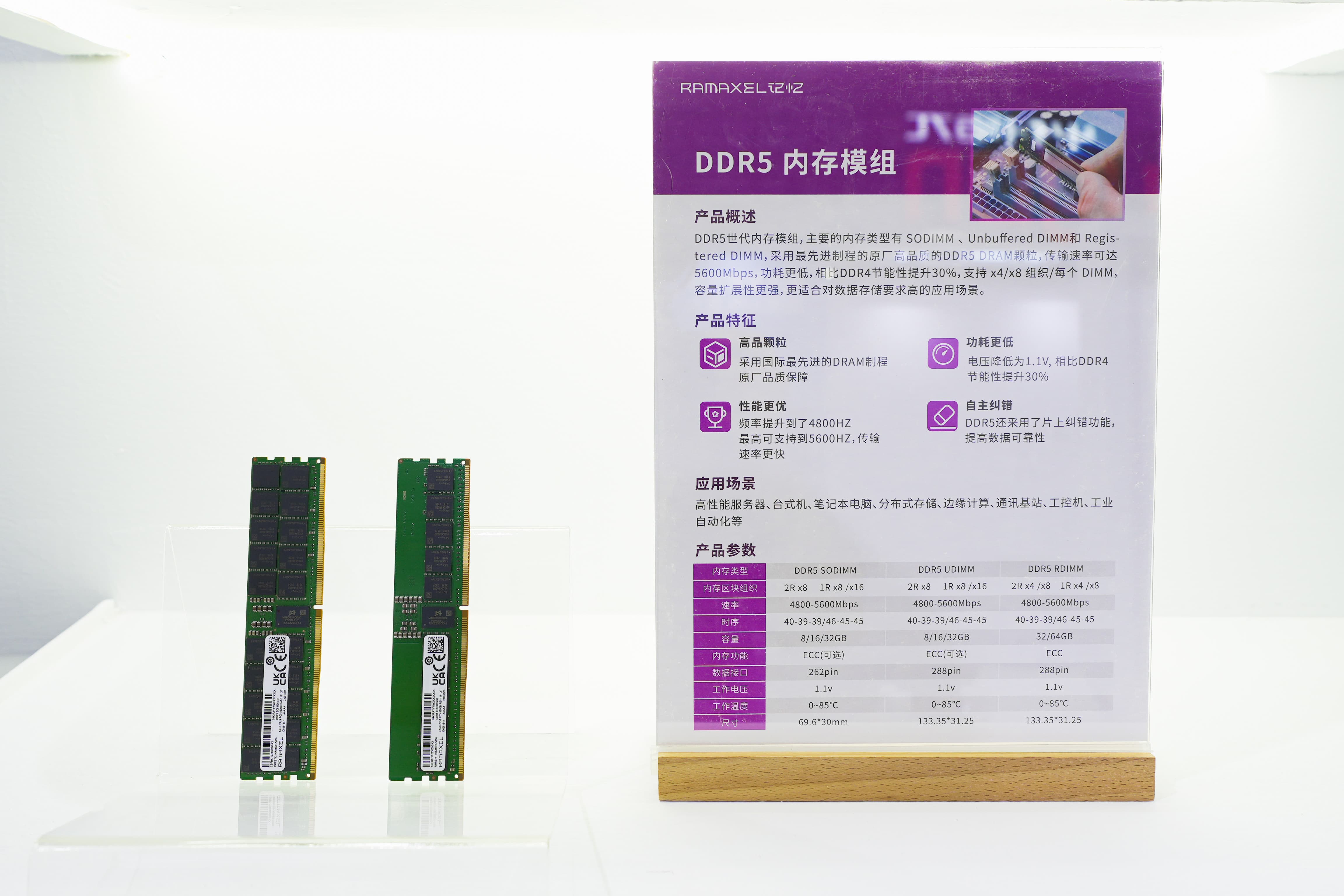 記憶科技的DDR5世代內存模組,引入了高速串行DDIMM(Differential Dual Inline Memory Modules)設計,支持 x4/x8 組織/每個 DIMM,為內存帶寬、性能與可靠性的提升奠定了基礎。同時,產品采用先進制程的原廠高品質DDR5 DRAM顆粒,傳輸速率可達5600Mbps,可滿足海量數據處理需求。