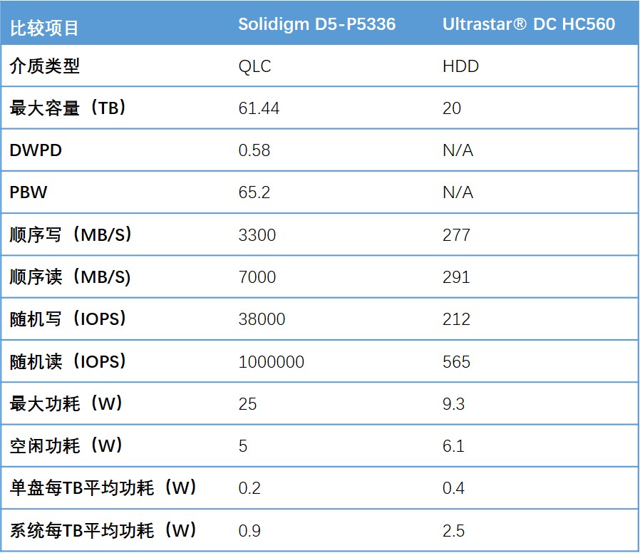 如圖2所示,與QLC SSD相比,HDD的最大容量小很多。HDD的順序讀寫和隨機讀寫性能與QLC SDD相比都差很多。HDD的單盤功耗小一些,但是每TB平均功耗比QLC SSD差很多。