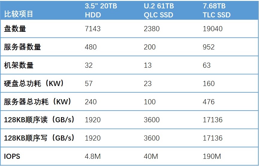 未來在很長一段時間內,HDD在每TB采購價格上仍然顯著優于QLC SSD。但是,QLC SSD的每TB功耗更低,在很多應用場景中,QLC SSD的總體擁有成本比HDD更低,下面以一個100PB對象存儲系統為例來說明。