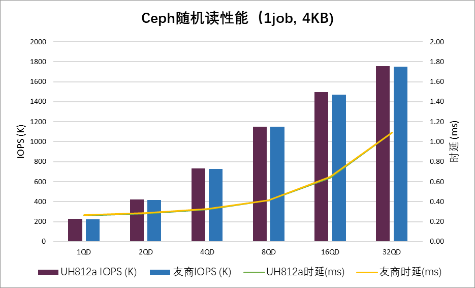 QD為32時,UH812a隨機讀IOPS突破175.5萬,時延穩定在1.1毫秒內;隨機寫IOPS突破19萬,時延穩定在9.9毫秒內。