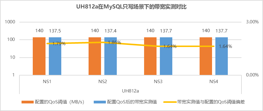 在只寫場景下,當IOPS的QoS閾值設置為8000,帶寬的QoS閾值設置到140MB/s時,UH812a依舊展現出強大的流控實力。在IOPS性能方面,其與QoS閾值的最大差距僅為0.28%;在帶寬性能上,最大差距也不過1.86%。由此可見,基于Docker化MySQL環境,UH812a NS技術下的QoS功能執行穩定且高效,整體性能波動范圍牢牢控制在2%以內,為高負載業務提供堅實保障。