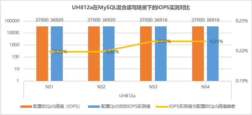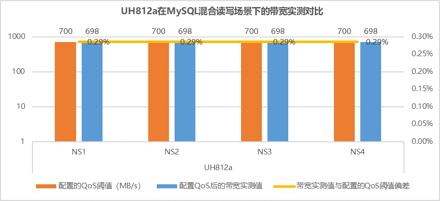 實測表明,在容器化 MySQL 環境中,無論是只讀、只寫還是混合讀寫場景,UH812a 的 NS 技術均能精準執行 QoS 設置,提供高效穩定的性能表現,有力支撐企業數據存儲與處理需求。