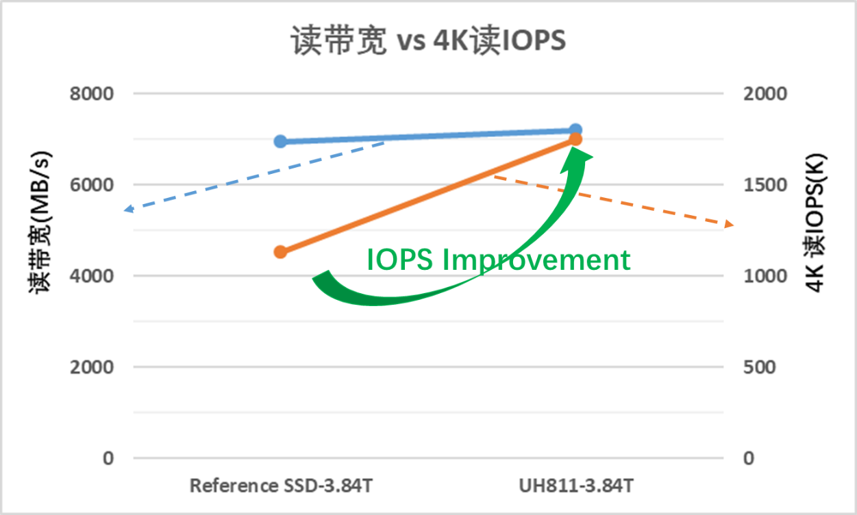 圖四以業(yè)內(nèi)某型號SSD為參考,與憶聯(lián)企業(yè)級固態(tài)硬盤產(chǎn)品UH811a進行了對比分析??梢钥吹?,兩款SSD的讀帶寬相當(dāng),都在7000MB/s左右,但UH811a的4K隨機讀IOPS相比參考SSD有顯著提升。進一步分析可以發(fā)現(xiàn),將UH811a的4K IOPS換算成帶寬,是與讀帶寬相當(dāng)?shù)?;但對參考SSD進行同樣的換算,則換算出來的帶寬只有讀帶寬的70%,原因就在于隨機讀操作的總線開銷高于順序讀。