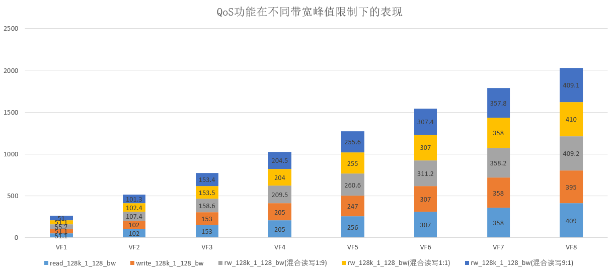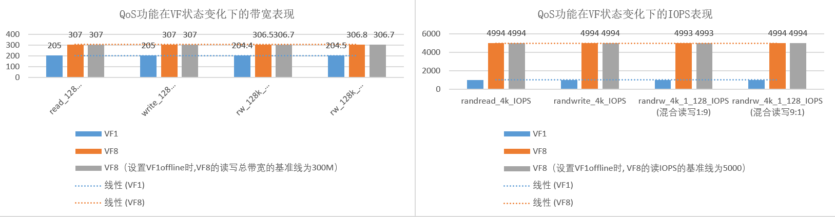 圖 2:QoS 功能在對不同 VF 設(shè)置不同流量限制下的帶寬及 IOPS 表現(xiàn)