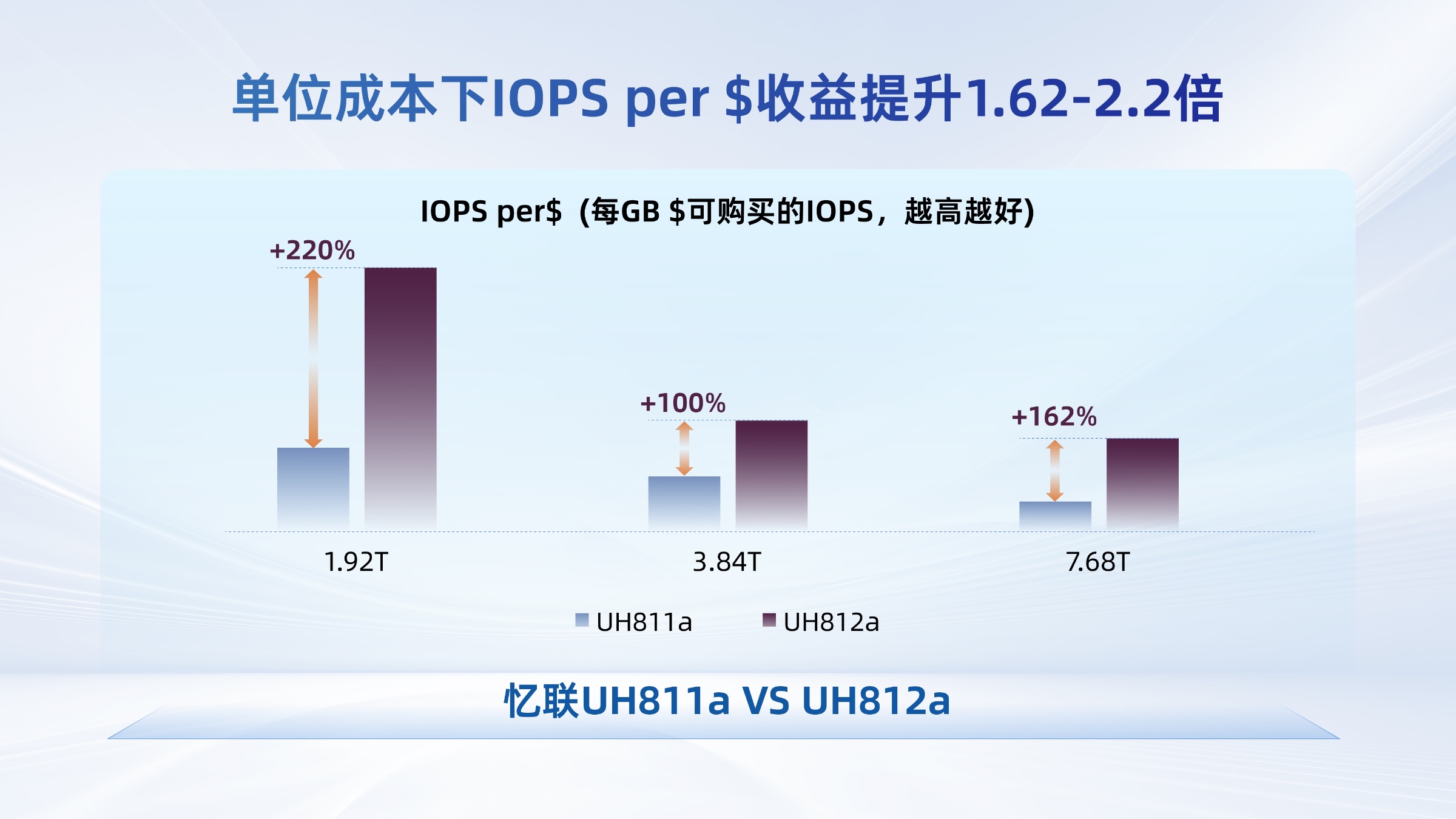 在DeepSeek等大模型加速落地的今天,存儲(chǔ)系統(tǒng)的價(jià)值已從單純的“數(shù)據(jù)容器”升級(jí)為“智能化基礎(chǔ)設(shè)施的核心組件”。憶聯(lián)基于產(chǎn)品的高能效比設(shè)計(jì)、場(chǎng)景化技術(shù)特性構(gòu)建及智能化運(yùn)維能力,為數(shù)據(jù)中心客戶提供最佳TCO存儲(chǔ)解決方案。以UH812a為例,其單位成本下的性能(IOPS per $)指標(biāo)比上一代Gen4產(chǎn)品(UH811a/UH831a)提升了1.62-2.2倍。這不僅能為客戶節(jié)省數(shù)據(jù)中心整體使用成本,同時(shí)存儲(chǔ)效率、可靠性的提升也將為用戶提供更好的業(yè)務(wù)體驗(yàn),助力企業(yè)長(zhǎng)期業(yè)務(wù)增長(zhǎng),實(shí)現(xiàn)經(jīng)濟(jì)效益與社會(huì)效益的協(xié)同與共贏,增強(qiáng)企業(yè)的市場(chǎng)競(jìng)爭(zhēng)力。