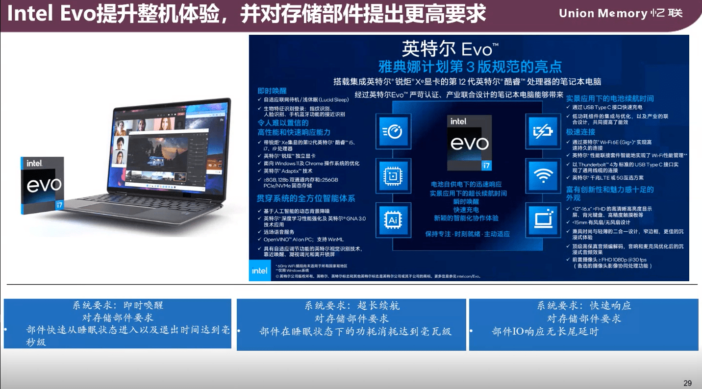 楊錦平表示,隨著英特爾Evo提升了整機體驗,對存儲部件設計也提出了更高要求:一是即時喚醒,需要存儲快速從睡眠狀態進入工作狀態;二是超長續航,則需要存儲部件在睡眠狀態下維持毫瓦級功耗;三是快速響應,存儲不能出現高延遲的情況。