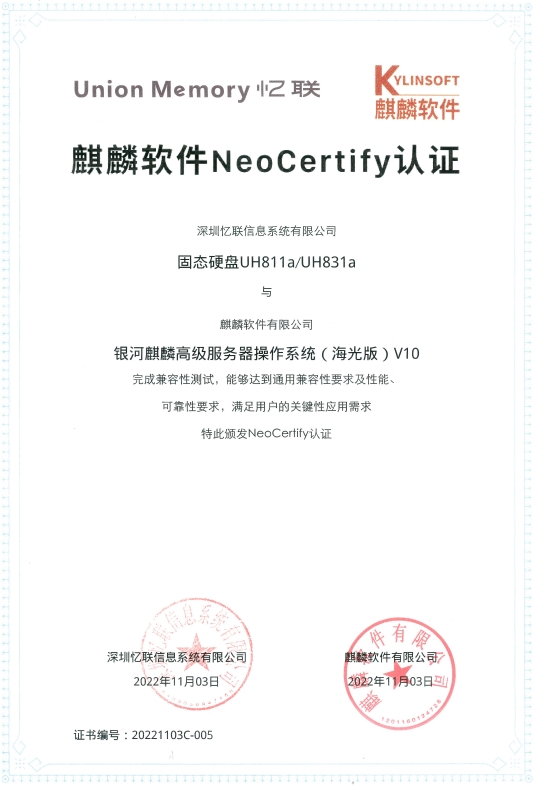 近日,憶聯(lián)(深圳憶聯(lián)信息系統(tǒng)有限公司)企業(yè)級(jí)固態(tài)硬盤UH811a&UH831a與麒麟軟件有限公司的銀河麒麟高級(jí)服務(wù)器操作系統(tǒng)(海光版)V10完成產(chǎn)品兼容性認(rèn)證。