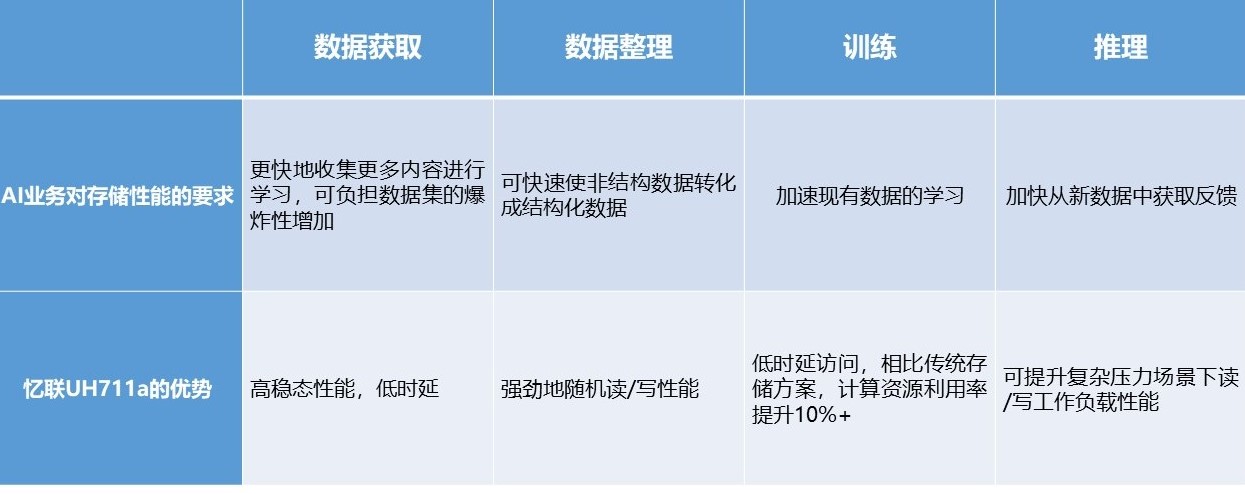 面對(duì)AI應(yīng)用更嚴(yán)苛的存儲(chǔ)要求,憶聯(lián)UH711a作為一款數(shù)據(jù)中心級(jí)SSD,憑借在各方面出色的性能表現(xiàn)可應(yīng)用在AI業(yè)務(wù)中的各個(gè)階段。