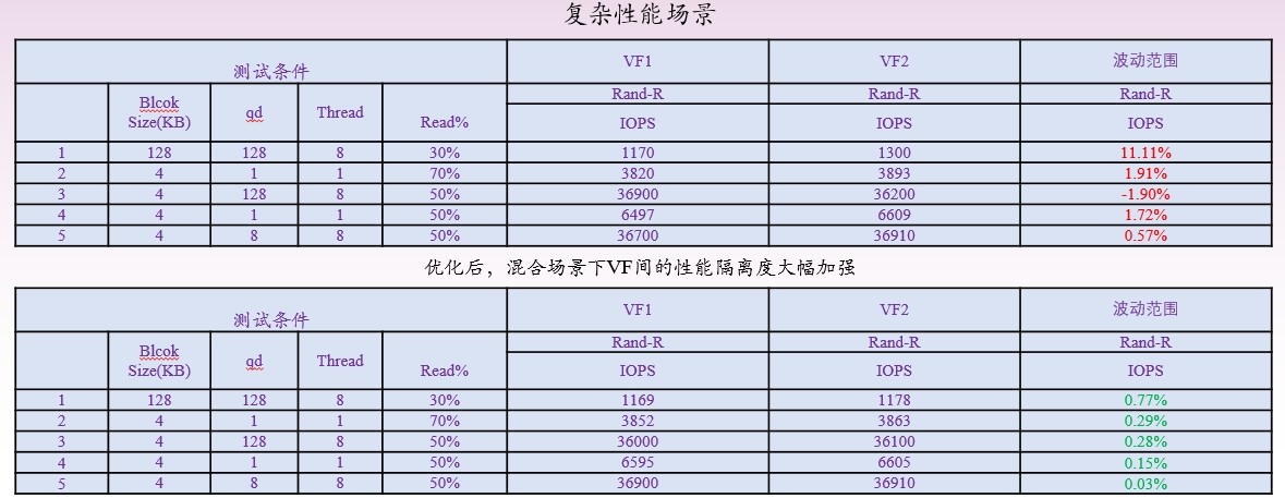 因SR-IOV技術(shù)可提供更好的密度性能、隔離性和安全性,目前已被數(shù)據(jù)中心廣泛采用。在面向AI應(yīng)用進(jìn)行部署與邏輯較為復(fù)雜的場(chǎng)景時(shí),SR-IOV可為用戶提供安全、優(yōu)質(zhì)的AI計(jì)算資源。UH711a 通過使能SR-IOV技術(shù)優(yōu)化云業(yè)務(wù)虛擬機(jī)場(chǎng)景,相比SPDK方案優(yōu)勢(shì)顯著。憶聯(lián)采用的SR-IOV 2.0優(yōu)化了各VF的性能隔離調(diào)度邏輯,使各VF間的性能隔離度更好,在純讀純寫場(chǎng)景下從原來的5%波動(dòng)降低到3%;混合場(chǎng)景業(yè)務(wù)的波動(dòng)從部分場(chǎng)景10%的波動(dòng)優(yōu)化到5%以內(nèi)。