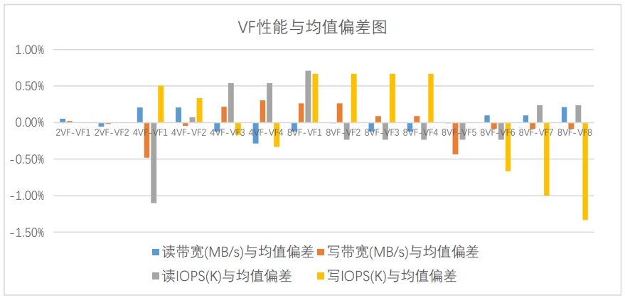 數據顯示,各 VF 測試值與 VF 均值基本偏差小于 1%,VF間性能分配較為穩定,擴展性較高,可靈活根據用戶需求進行 VF 數量設置及管理。