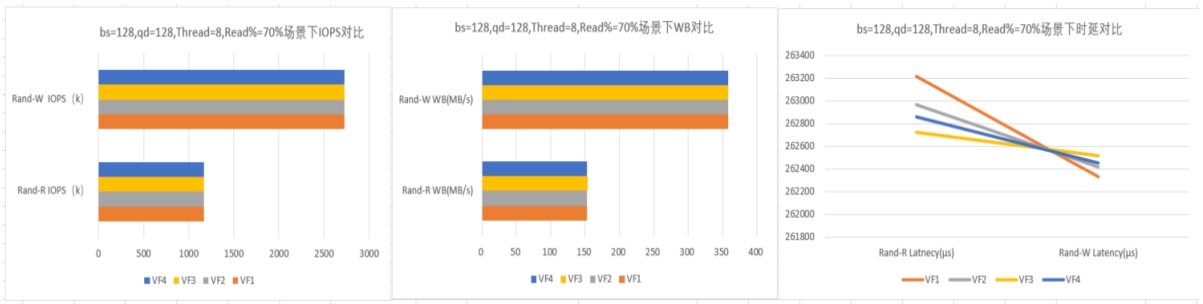 本次在 SR-IOV 功能下的不同 VF 場景下總性能與整盤的性能對比圖如下(以下數據為此次驗證數據,僅供參考)。