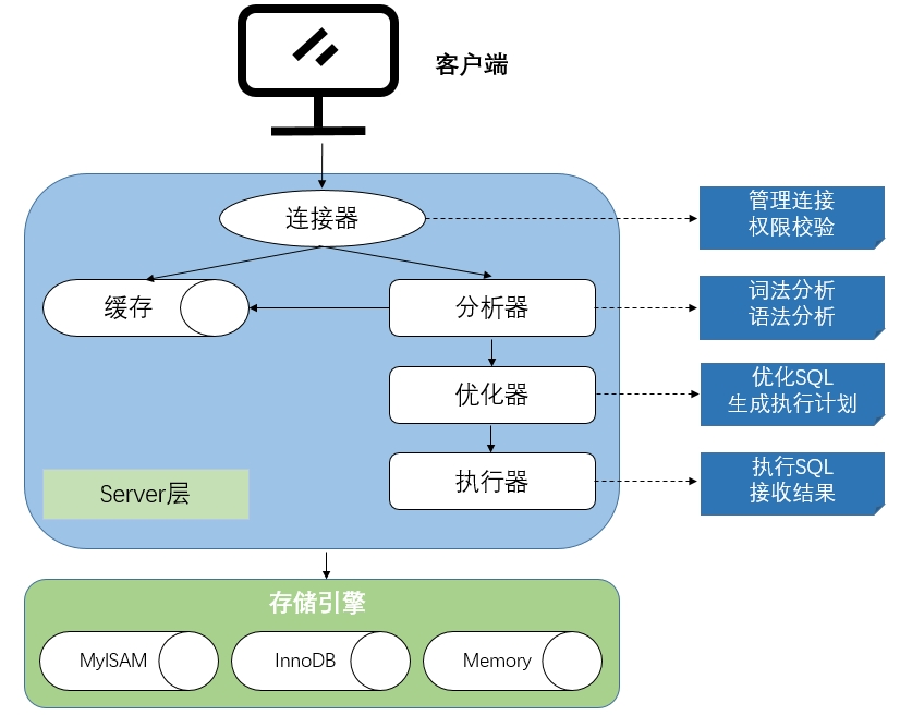 MySQL 是當前最流行的關(guān)系型數(shù)據(jù)庫管理系統(tǒng)之一,因其代碼開源,且具備體積小、速度快、較低的TCO等優(yōu)勢,在大、中、小型企業(yè)中皆有應用。MySQL 在架構(gòu)上主要分為 Server 層和存儲引擎層。其中 Server 層又分為連接器、緩存、分析器、優(yōu)化器、執(zhí)行器,所有跨存儲引擎的功能都在這層實現(xiàn);存儲引擎是可插拔式的,常見的存儲引擎有 MyISAM、InnoDB、Memory 等。