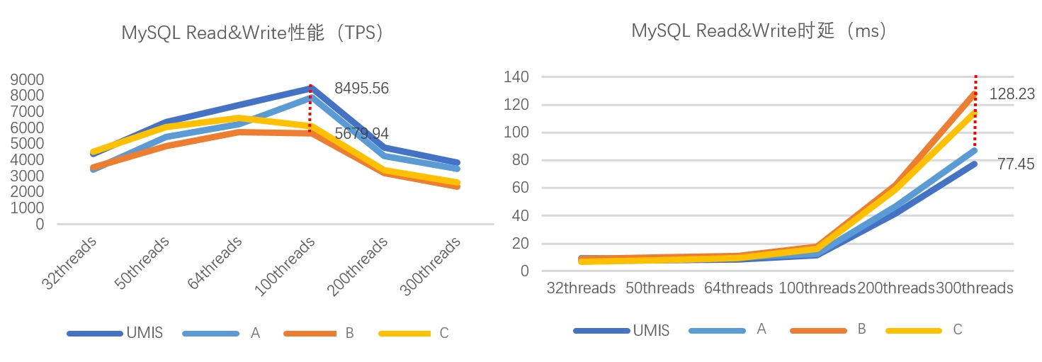 根據(jù)圖 3 可以看出,在 MySQL 讀性能下,憶聯(lián) UH8 系 SSD 在 50-100 線程之間性能最優(yōu),對比友商 TPS 最高可提升 122%,時延最高可降低 91%。在 MySQL 只讀性能驗證環(huán)境下,憶聯(lián)優(yōu)勢表現(xiàn)明顯,可充分支撐 MySQL數(shù)據(jù)庫的讀取速度,提升系統(tǒng)訪問速率。
