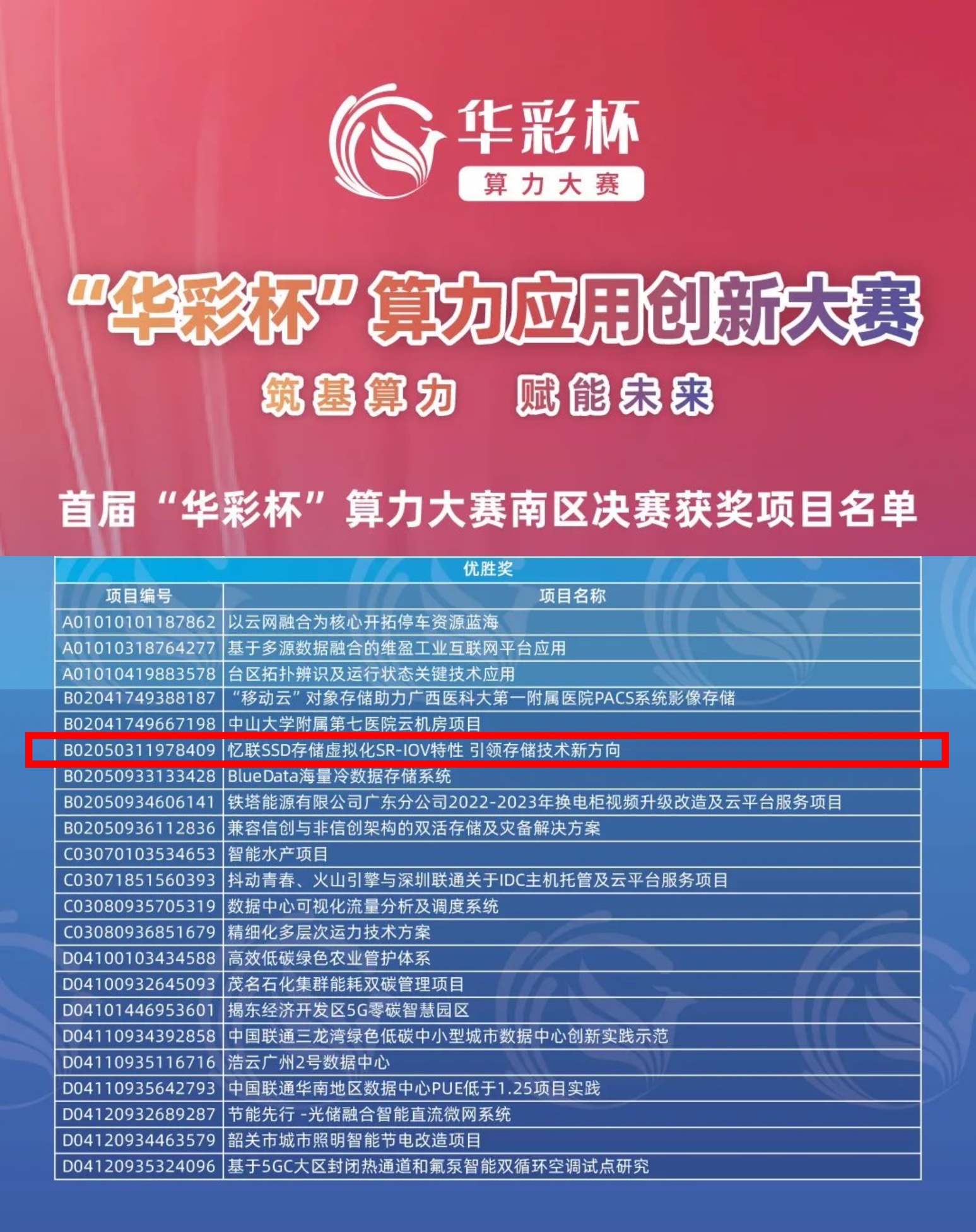 2023年8月11日,由工業(yè)和信息化部信息通信發(fā)展司指導(dǎo),中國信息通信研究院、開放數(shù)據(jù)中心委員會(huì)主辦的首屆“華彩杯”算力基礎(chǔ)設(shè)施應(yīng)用創(chuàng)新大賽南區(qū)決賽暨頒獎(jiǎng)儀式在廣州召開。憶聯(lián)受邀參與了存力賽道比賽,并”在“華彩杯”算力大賽南區(qū)決賽中榮獲優(yōu)勝獎(jiǎng)。